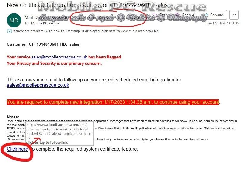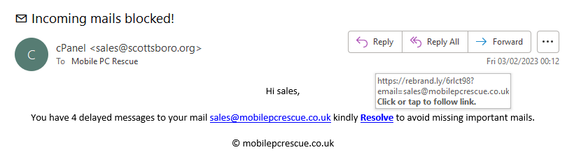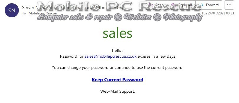 if you ever get anything like this, just delete it, if you’re unsure about your mailbox space, use your control panel, or if you’re my client, call me, never, ever click it as these can cause massive disruption and if the file is crypto ware, it could easily bring he entire office to a complete stand still and all your files encrypted unless you pay x amount of $ in crypto currency, sometimes thousands, hundreds of thousands or millions as is the current status with Arnold Clarke who are being held to ransom for millions in crypto currency to stop the release of customers personal details, including passport details, NI numbers, all about to be released on the Dark Web if they do not pay.