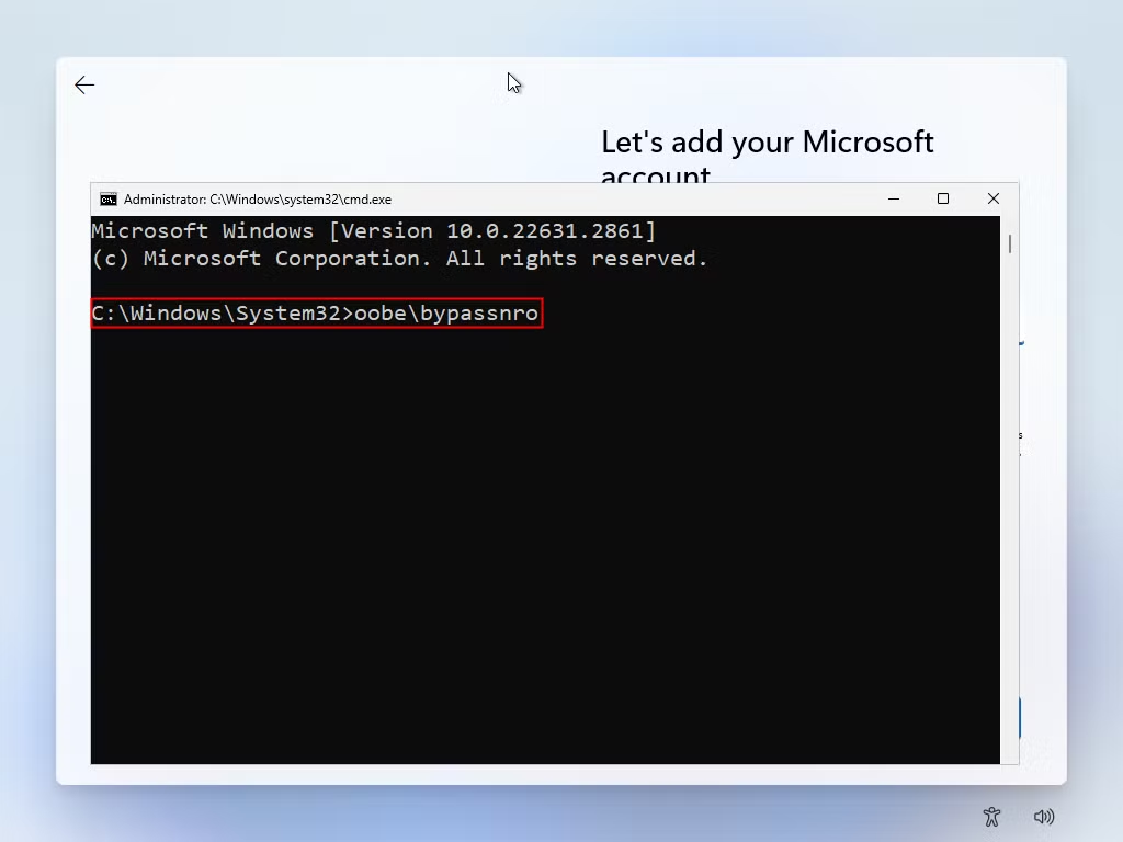 - Type the following command to modify the Registry to bypass the internet and Microsoft Account requirements, and press Enter:reg add HKLM\SOFTWARE\Microsoft\Windows\CurrentVersion\OOBE /v BypassNRO /t REG_DWORD /d 1 /f