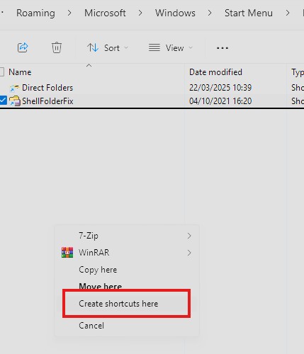 So, now find the ICON of the program you want to auto run, and pressing your RIGHT MOUSE BUTTON on the icon and HOLDING IT DOWN, DRAG it to this folder, it will show a menu, click on CREATE SHORTCUTS HERE: