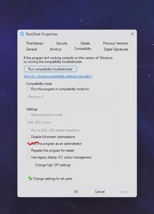 To do this, RIGHT MOUSE CLICK the icon and go to Properties, then click on COMPATIBILITY: