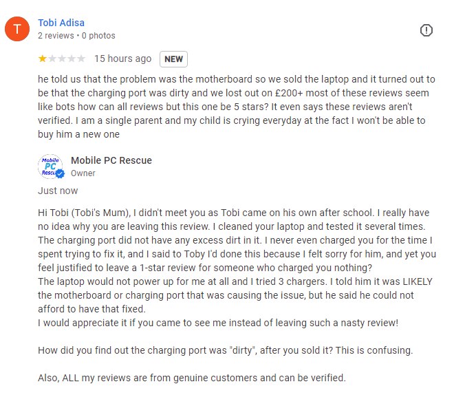 Yesterday I got my first ever 1-star review. I am really upset that this has happened, especially given the fact I did not charge the boy anything as I felt sorry for him. The laptop was very dirty, and I cleaned it and tested 3 brand new chargers, none of them worked. This was 2 months ago, and they never contacted me, they just left this disparaging review. Working as a sole trader is extremely difficult, and these bad reviews damage small businesses. Had she contacted me I would have given Tobi an old laptop (I have a few that won’t run Windows 11, so I won’t sell them, but I’d have been happy to give one to someone who needed it. She also questions if my other reviews are bots, which of course they are not. I work damn hard for my customers, and this reflects in all my other reviews.