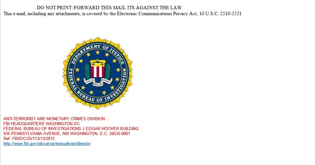 We sincerely apologize for sending you this sensitive information via e-mail instead of a certified mail, phone call or a face-to-face conversation,We will also send you a certified email later it is due to the urgency and importance of the security information needed. To checkmate financial recklessness, illegal gambling, racketeering and considering the effect of the global financial crisis rocking the United States, our government with the help of the Federal Bureau of Investigation (F.B.I) Washington, DC and the internet crime complaint center (ic3),alongside the CIA signed an agreement with U.K police for an immediate release of all overdue funds presently logged in their treasury and to ensure it is disbursed to the rightful beneficiaries in all parts of the world. If you the beneficiary would adhere to our instruction it will help you receive your payment immediately