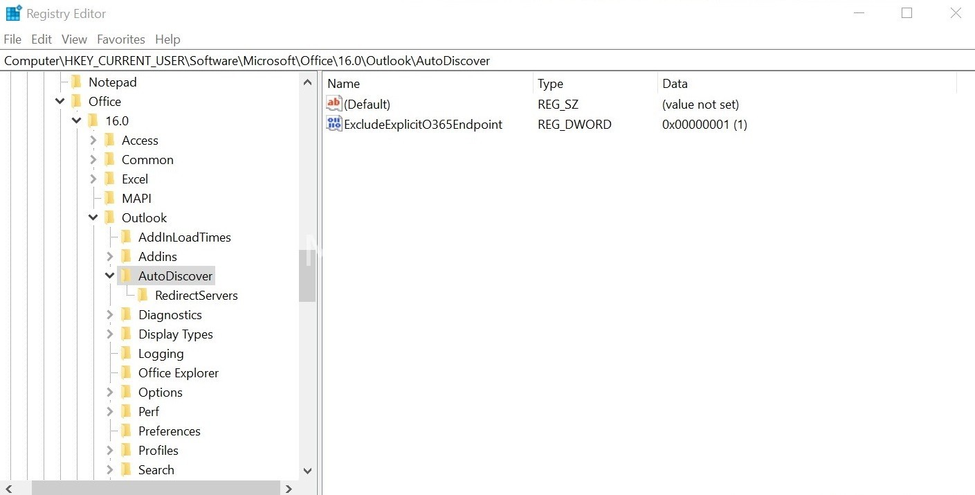 HKEY_CURRENT_USER\SOFTWARE\Policies\Microsoft\office\16.0\outlook\autodiscover DWORD: ExcludeExplicitO365Endpoint Value = 1