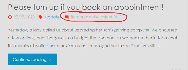 A great example of this is WordPress today, it has updated to v6.5 on my website and that of all my customers, this has left my website with an error due to a theme issue, and on my Blog I have this text which looks a mess (itemprop=”discussionURL”1), the only solution I have found is to turn comments off which removes the text, but this means I have to now go through my entire Blog and turn off comments on all my posts (one by one), which is time consuming and not something I want to do, but I prefer that to my website looking broken.